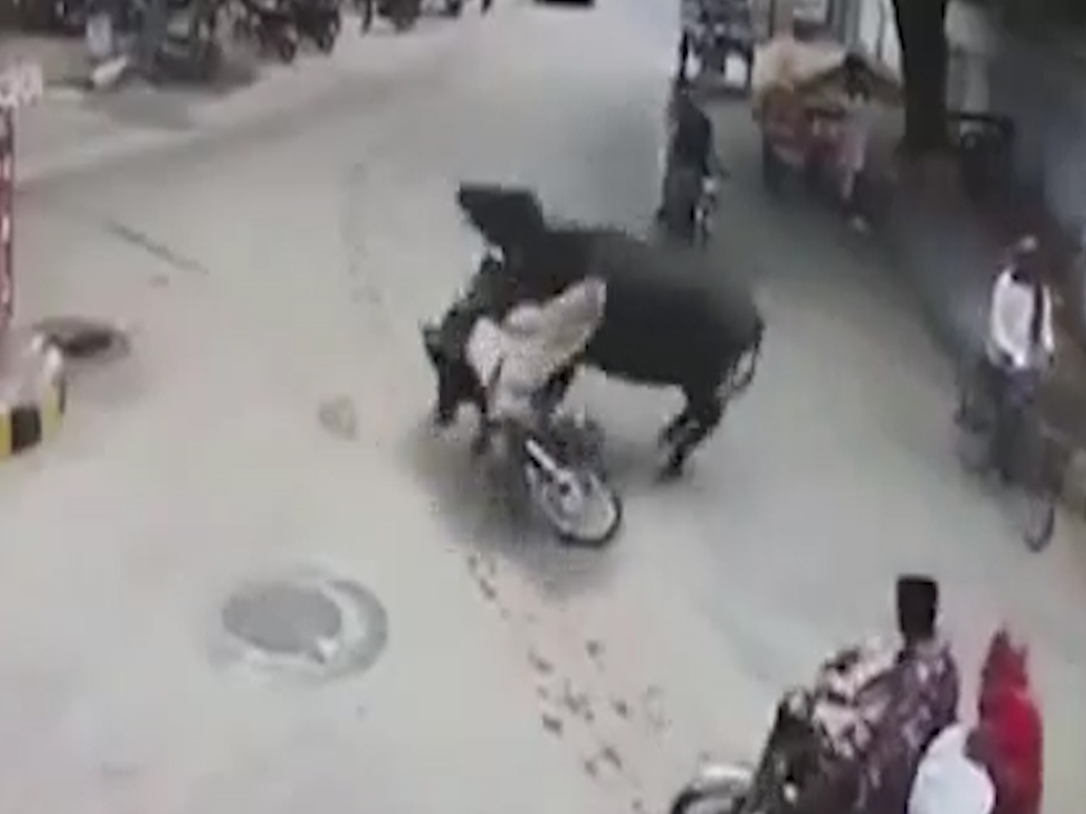 Người đàn ông đang điều khiển xe máy tại ngã tư tại Pakistan bị một con trâu húc văng xuống đất, bất tỉnh tại chỗ.
