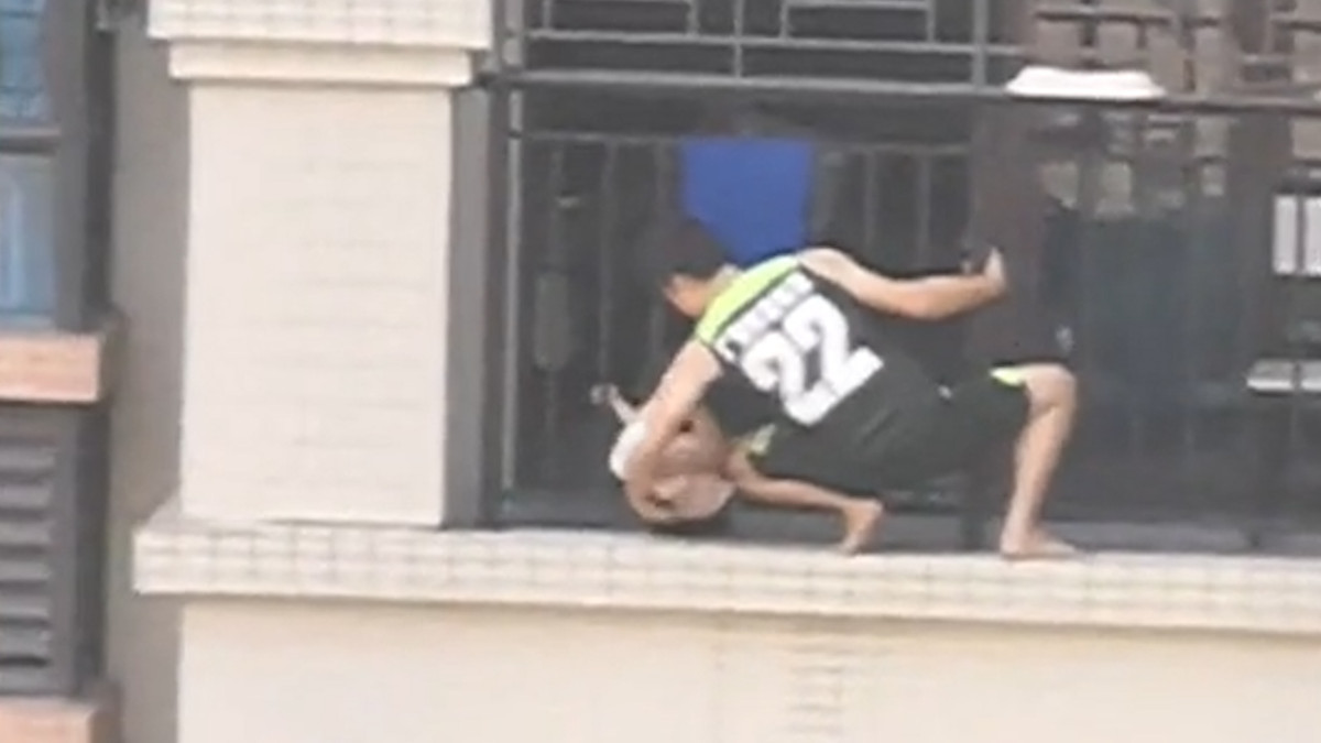 Người đàn ông treo mình ngoài ban công để giải cứu đứa trẻ bị kẹt đầu vào giữa lan can trên tầng 7 một chung cư tại TP Phật Sơn (Quảng Đông, Trung Quốc).