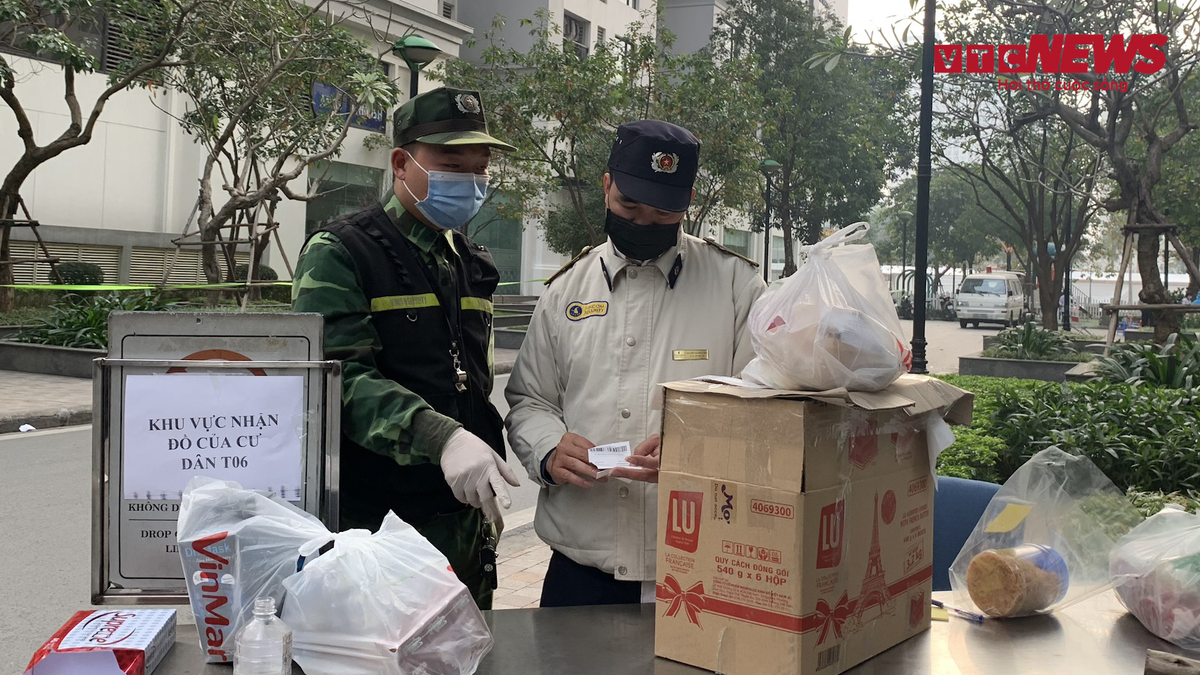 Sau thông báo phong toả toà nhà T6, khu Vinhomes Times City (Hà Nội) vì có ca mắc COVID-19, nhiều người dân đến tiếp tế nhu yếu phẩm cho cư dân tại đây.