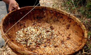 Dùng cây gậy dài 3m, treo chiếc rổ, ông Trần Văn Hùng thọc tổ hứng trứng kiến vàng đem bán kiếm vài trăm nghìn đồng mỗi ngày.