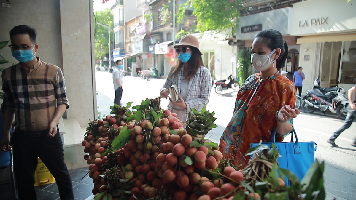 Người dân Hà Nội đến các điểm bán vải Bắc Giang trên một số tuyến phố lớn, để cùng chung tay tiêu thụ vải thiều giúp cho người dân vùng dịch Bắc Giang.
