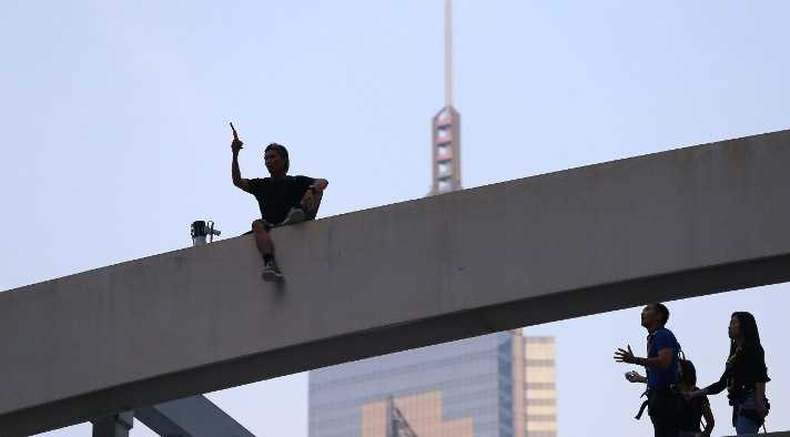 Với chiếc loa cầm tay, người đàn ông hét lên sẽ nhảy khỏi cầu nếu các lãnh đạo cuộc biểu tình không đến nói chuyện với mình.