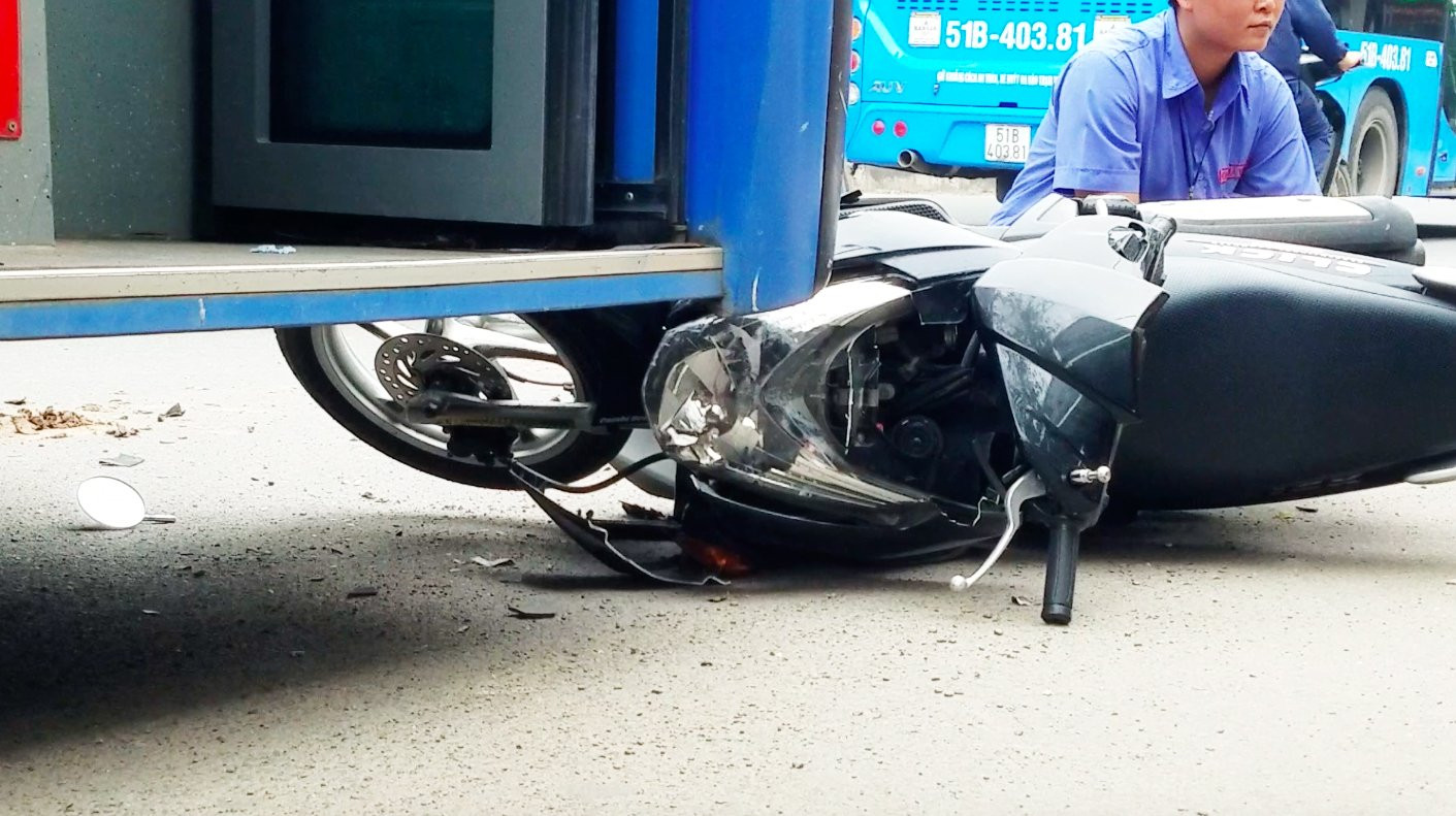 Một người phụ nữ lái xe máy chạy ngược chiều, sau đó tông trực diện vào đầu xe buýt khiến người này bị thương nặng.