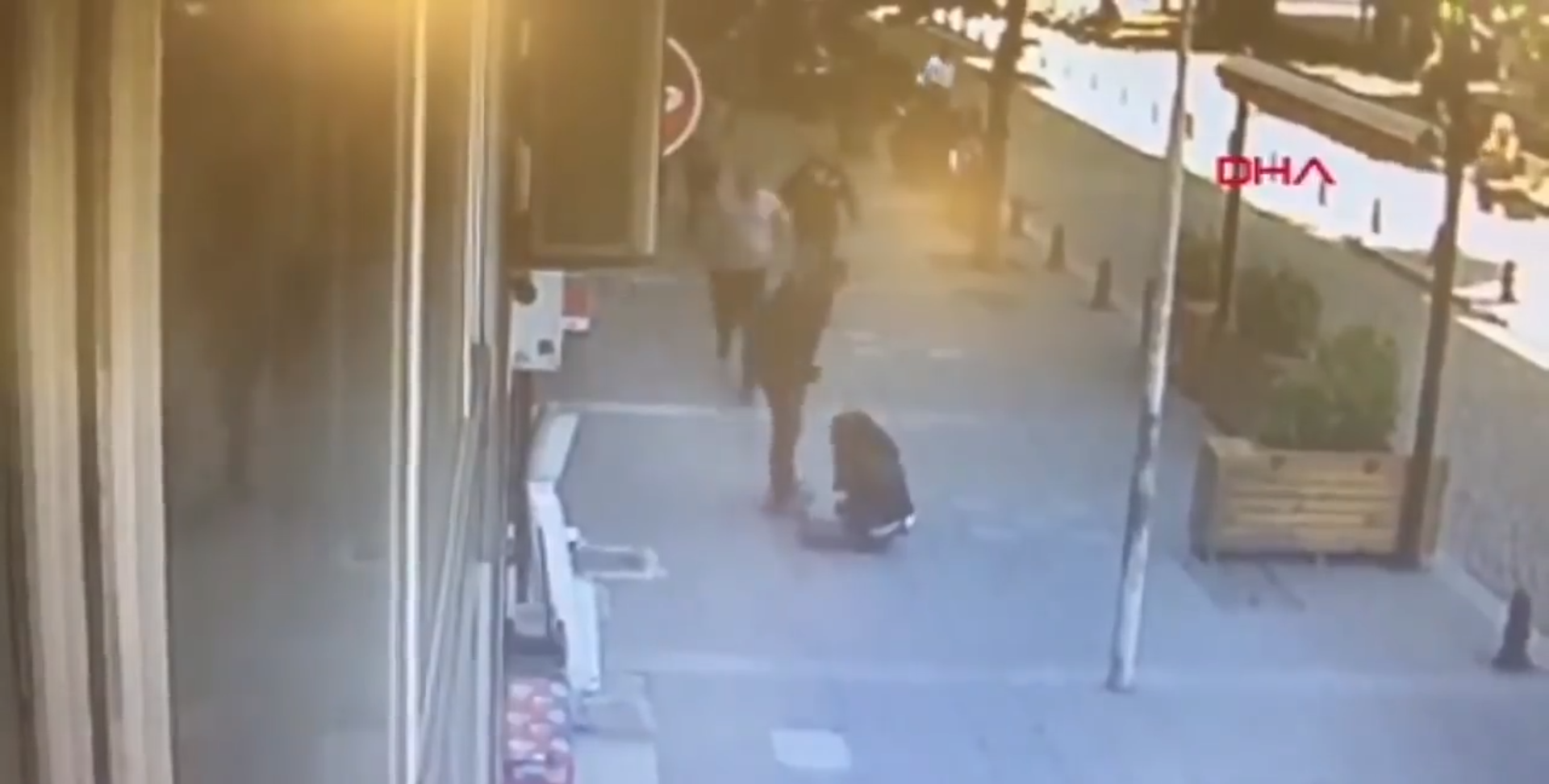 Đoạn video nói trên được trích xuất từ camera an ninh tại thành phố Istanbul, Thổ Nhĩ Kỳ. Theo thông tin từ truyền thông địa phương, người phụ nữ trong ảnh bị người chồng cũ cầm cuộn giấy đánh và đẩy ngã xuống vỉa hè. Tuy nhiên, 1 người qua đường chứng kiến cảnh này và chạy nhanh đến, dùng “thiết đầu công” hạ gục ông chồng cũ đang giở trò bạo lực và ấn người này xuống vỉa hè.