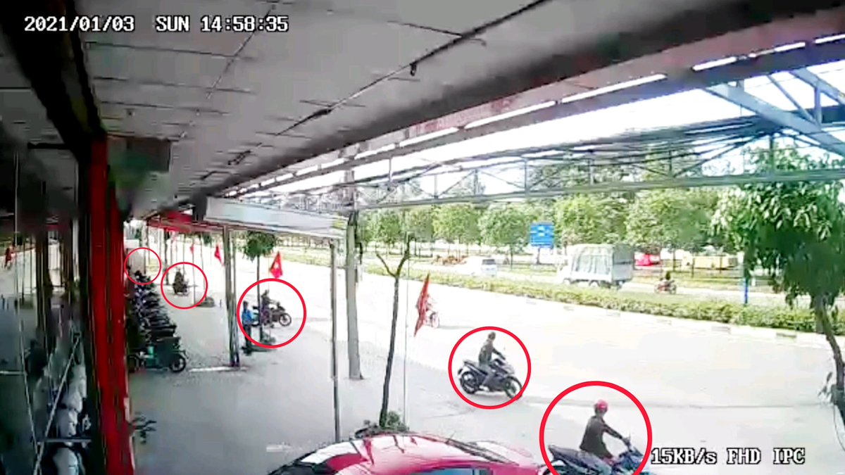 5 tên trộm đi trên 3 xe máy tiếp tục dàn cảnh đánh lừa bảo vệ, bẻ khóa và trộm xe máy tại một cửa hàng trên đường ĐT 746, thị xã Tân Uyên, tỉnh Bình Dương.