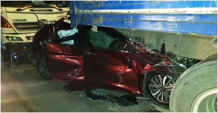 23/08/2019 12:06:00 +07:00Ô tô 4 chỗ ở TP. HCM bị xe tải 8 tấn tông mạnh từ phía sau, đẩy nó đâm đuôi xe tải khác đang dừng đèn đỏ, 4 người may mắn thoát chết.