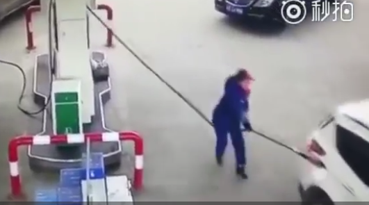 Vụ việc xảy ra tại một cây xăng ở tỉnh An Huy, Trung Quốc. Trong video được Shanghaiist đăng tải, nhân viên đang tới gần để lấy vòi xăng thì chiếc xe lăn bánh.