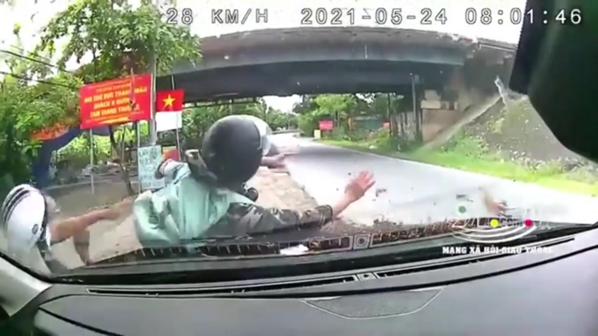 Ô tô chạy ngược chiều với tốc độ cao, bất ngờ tông trúng xe máy khiến hai nam thanh niên văng xuống đường tại Phú Thọ.