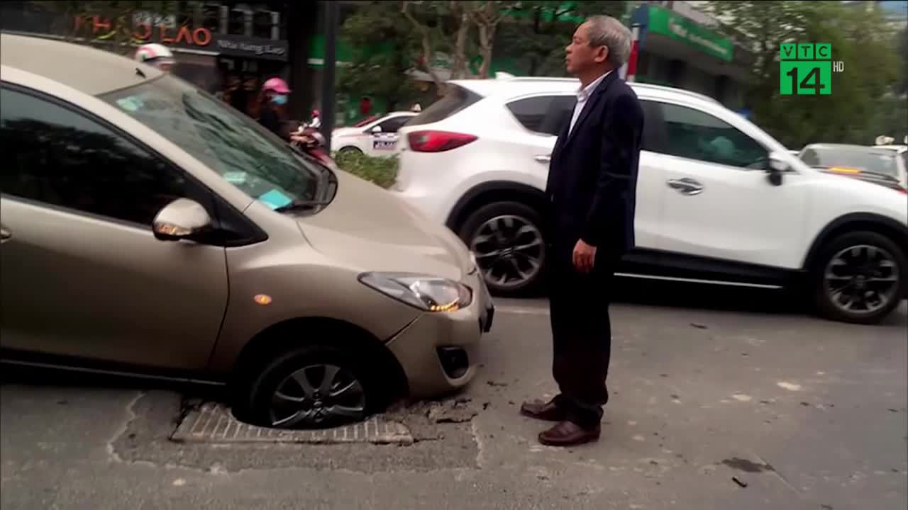Video: Ô tô Mazda bị sập hố ga, 'mắc cạn' giữa phố