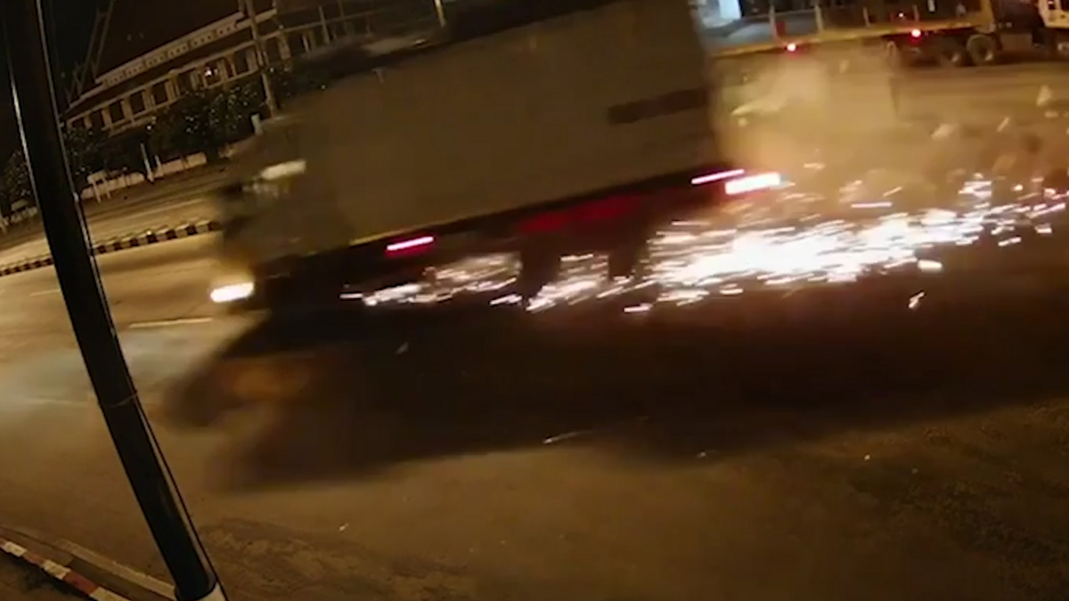 Xe tải vượt đèn đỏ, tông bay xe bán tải rồi lao vào một cửa hàng bên đường tại miền đông bắc Thái Lan.