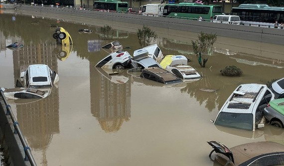 Nhũng chiếc ô tô chìm trong biển nước lũ tại một con phố ở Trịnh Châu. (Ảnh: 163)