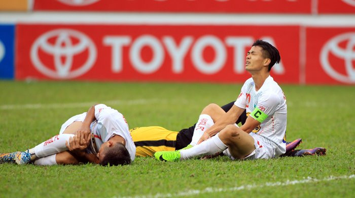 Công Phượng bị đau sau tình huống bỏ lỡ cơ hội. (Ảnh: Hùng Linh)
