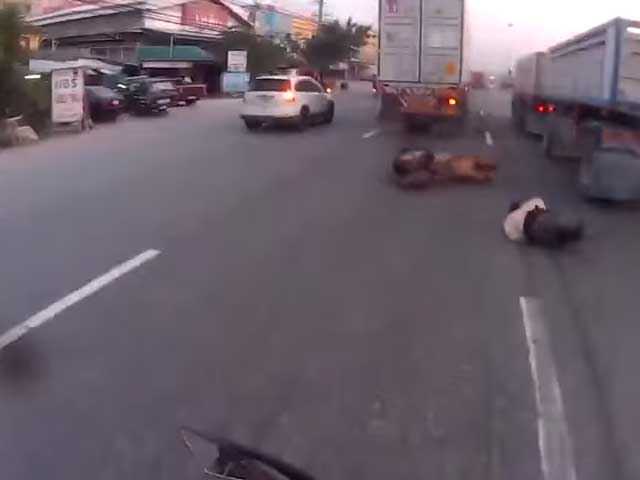 (VTC News) - Đi rất ẩu, chen lách vào giữa 2 xe tải lớn đang chạy tốc độ cao, người đi xe mô tô ngã nhào xuống, may mắn thoát chết một cách kỳ diệu.