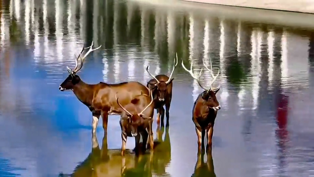 Bốn con hươu sừng trắng được nhìn thấy đang lang thang và bơi trên sông, loài hươu này thường sống ở cao nguyên Tây Tạng và số lượng còn rất ít.