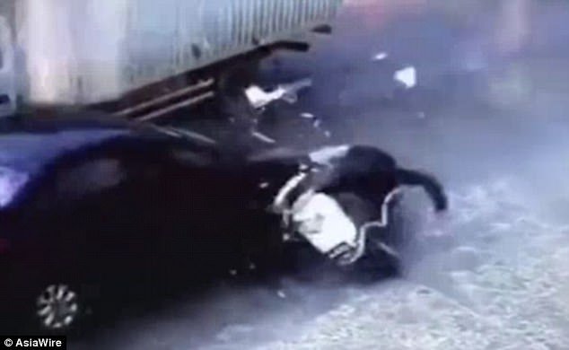 Tuy nhiên, khi băng qua đoạn đường đông đúc, do phóng đi với tốc độ nhanh và không kịp quan sát, tên cướp điều khiển chiếc xe ăn cướp màu trắng va chạm với một chiếc xe tải. Ngay sau đó, chiếc xe tiếp tục bị một chiếc ô tô khác đâm văng.