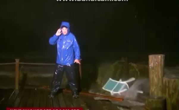 Khi đưa tin bão, Mike Seidel, phóng viên hiện trường của Weather Channel đứng gần mép nước và suýt bị một chiếc ghế bay trúng mặt.