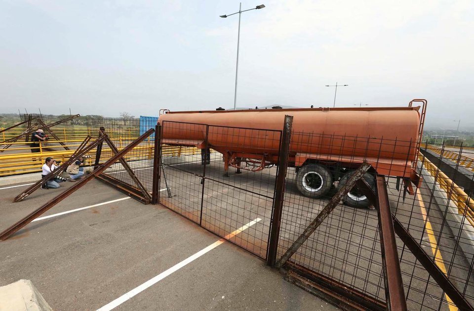 Khoảng trưa 6/2 (giờ địa phương), một xe chở nhiên liệu và hai container nằm ngang chặn cầu quốc tế Tienditas, nối Venezuela và Colombia. Các thành viên lực lượng cảnh vệ quốc gia Venezuela cũng xuất hiện tại cây cầu.