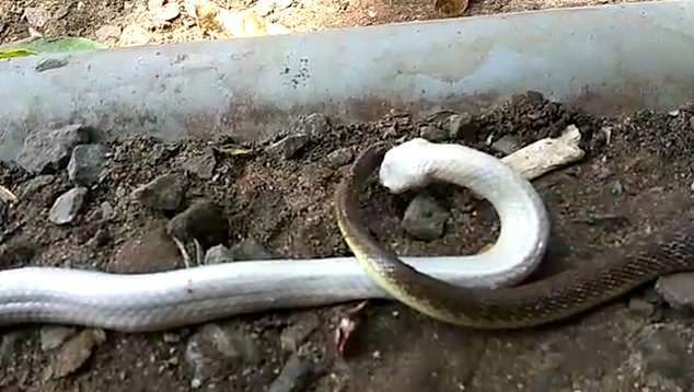 Anh Mirza Mohd trong lúc dạo quanh ngôi đền Bhadrak ở phía đông bang Odisha, Ấn Độ bất ngờ phát hiện một con rắn bạch tạng đang tìm cách nuốt chửng một con rắn nâu khác có kích cỡ tương đương.