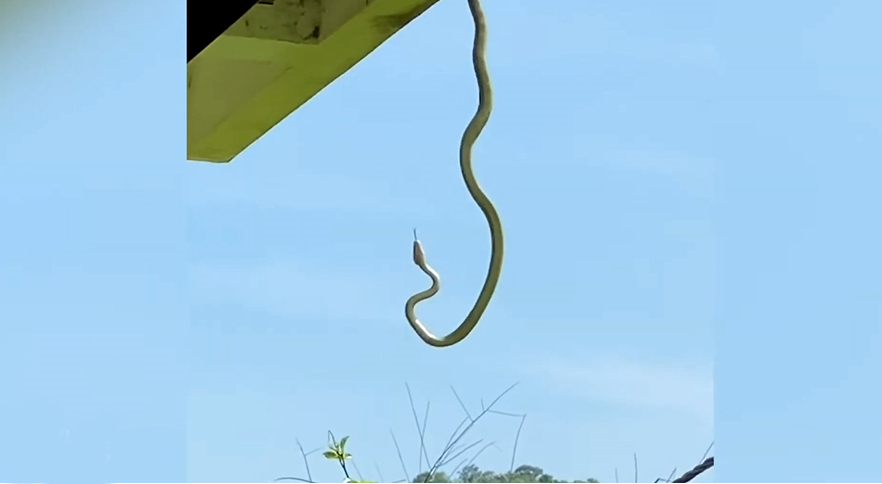 Video: Rắn đu mình trên mái nhà, phá bĩnh bữa sáng của khách