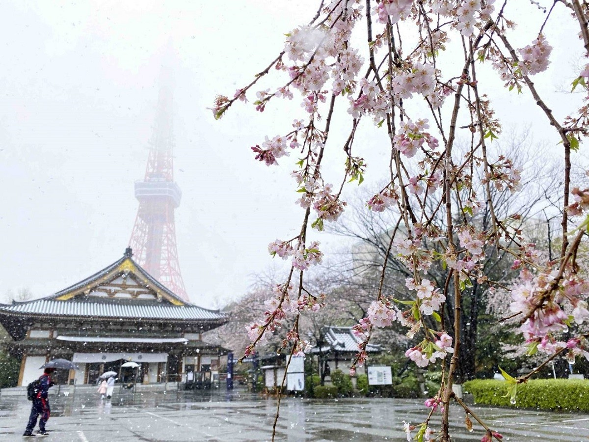 Tokyo bất ngờ đón đợt tuyết rơi vào cuối tháng 3, trùng thời điểm hoa anh đào nở đẹp nhất.