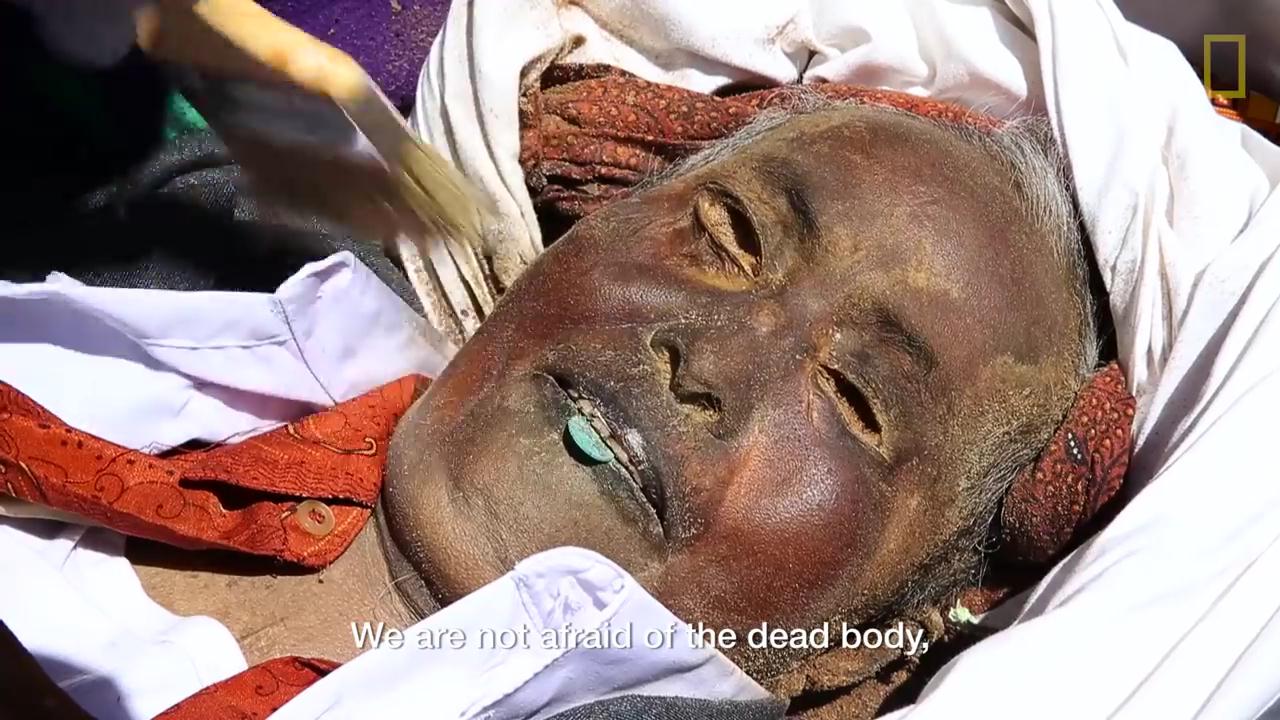 Người dân đảo Sulawesi (Indonesia) thể hiện tình yêu với người thân quá cố bằng cách giữ thi thể họ trong nhà suốt nhiều tuần, nhiều tháng, thậm chí nhiều năm, cho họ ăn và chăm sóc họ như khi còn sống.