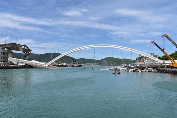 Khoảnh khắc cây cầu vòm đơn dài 140m bị sập ở Nanfang'ao, trên bờ biển phía đông Đài Loan sáng sớm 1/10 đã được ghi lại. Trong video, một sợi cáp thẳng đứng ở giữa vòm thép của cây cầu đột nhiên bị giật. Cầu sau đó sụp xuống nước, đổ lên ba chiếc thuyền đánh cá. Một tàu chở xăng dầu gần như đã vượt qua cũng lao xuống nước.