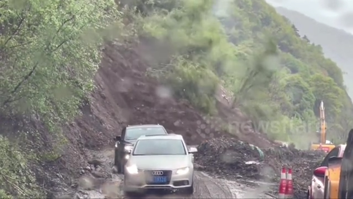 Vụ lở đất đổ xuống một con đường ở miền nam Trung Quốc chỉ vài giây sau khi đoàn xe hơi chạy qua.