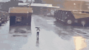 Một nhân viên bảo vệ đi tuần tra tại một kho hàng ở Jakarta, Indonesia bị tia sét đánh trúng chiếc ô, phóng ra tia lửa, nhân viên này thoát chết một cách thần kỳ.
