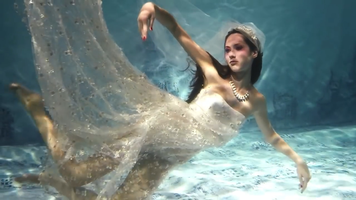 Những người mẫu mặc đầm dạ hội đi catwalk, rồi tạo dáng với đầm dạ hội dưới nước của NTK người Nga Jana Nedzvetskaya thu hút hàng triệu lượt xem trên mạng xã hội.