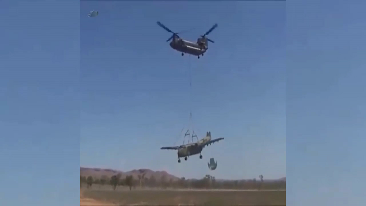Siêu trực thăng vận tải CH-47 Chinook, Mỹ thể hiện sức mạnh phi thường khi kéo một chiếc máy bay cỡ lớn lên không trung.