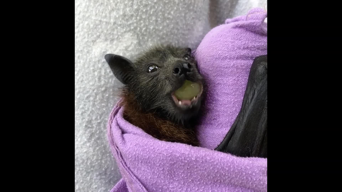 Từ 7 tuần tuổi, dơi con có thể bắt đầu ăn nhiều loại trái cây khác nhau. Trong video, người cứu hộ đang cho dơi ăn thử loại quả mới.