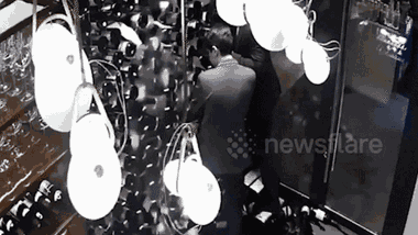 Nhân viên đang sắp xếp kệ rượu tại một nhà hàng ở St Petersburg, Nga thì một sợi dây trong kệ bị đứt, gây ra phản ứng dây chuyền khiến hàng trăm chai rơi xuống đất.