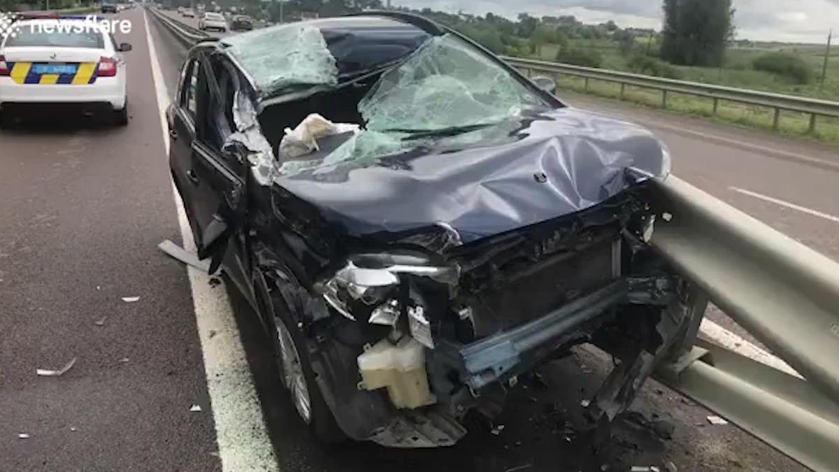 Tài xế xe hơi đã may mắn thoát chết khi ngủ quên, lao thẳng vào đuôi xe tải chạy cùng chiều tại Ukraine.