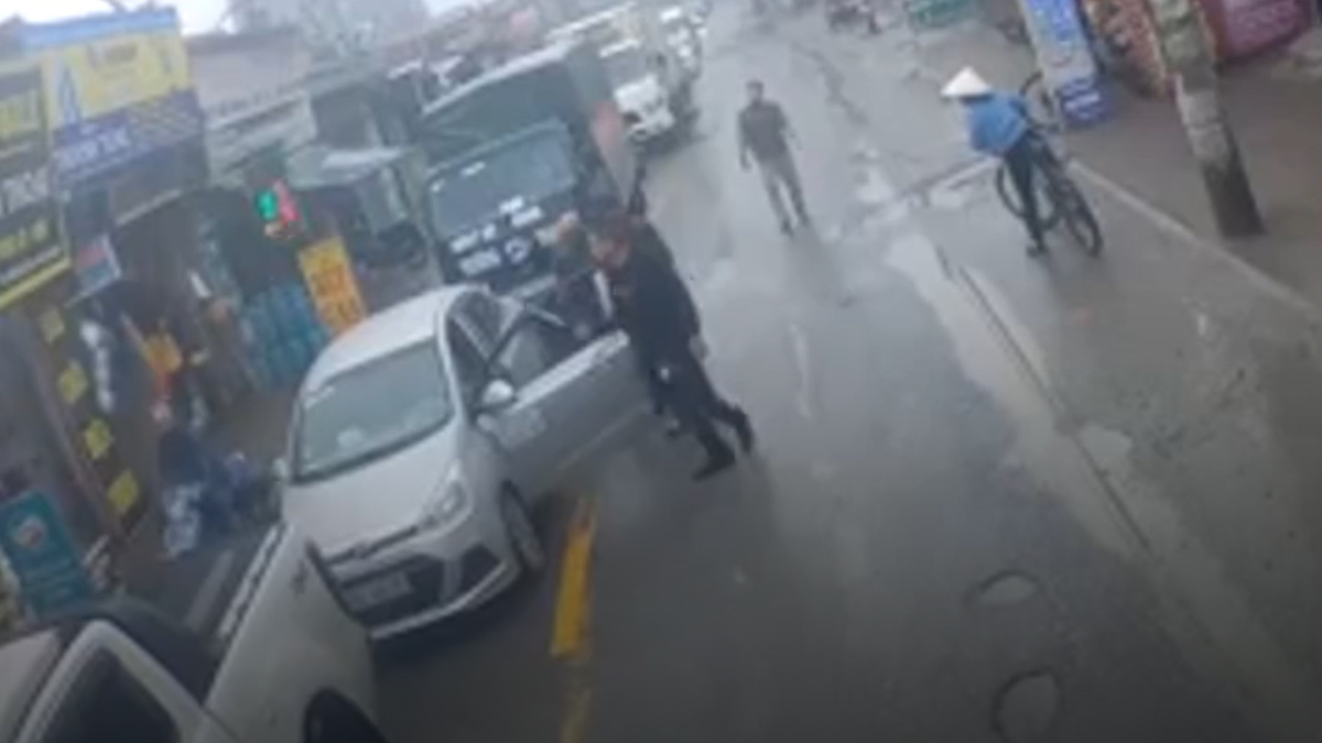 Tài xế xe bán tải chặn trước đầu một xe con và dùng hung khí liên tục đập vào thân xe, yêu cầu tài xế ô tô phải bước xuống, sự việc xảy ra tại ngã tư Nhổn (Hà Nội).