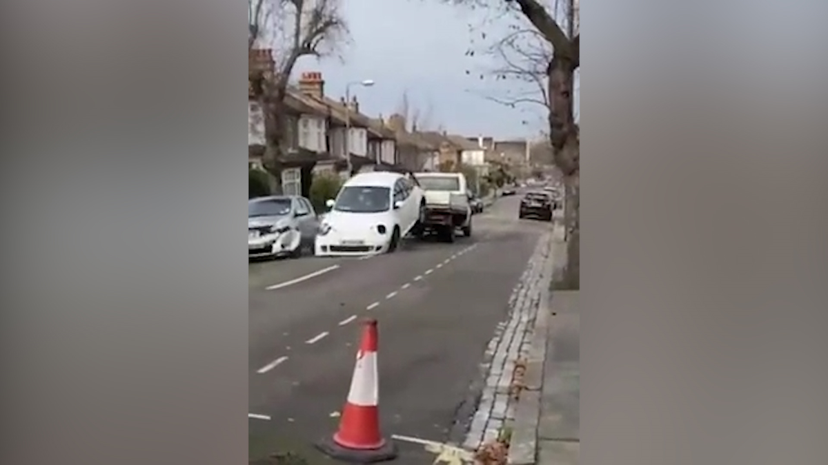 Mặc kệ chiếc Beetle được kéo sau xe cẩu bị quăng quật, làm hư hỏng một loạt xe đỗ bên đường, tài xế vẫn đi với tốc độ cao dọc một con phố ở London.