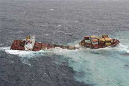 | Hình ảnh vỡ đôi của tàu Rena ngoài khơi biển New Zealand. |