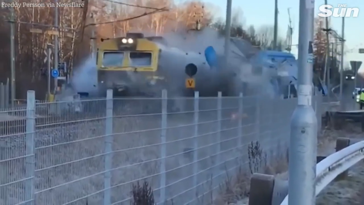 Video: Tàu hoả đâm bay xe buýt dừng trên đường ray ở Thuỵ Điển