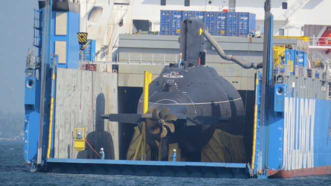 Sáng 29/1, tàu Rolldock chở theo tàu ngầm HQ 184 mang tên Hải Phòng đã neo đậu an toàn trong vịnh Cam Ranh, tỉnh Khánh Hòa.
