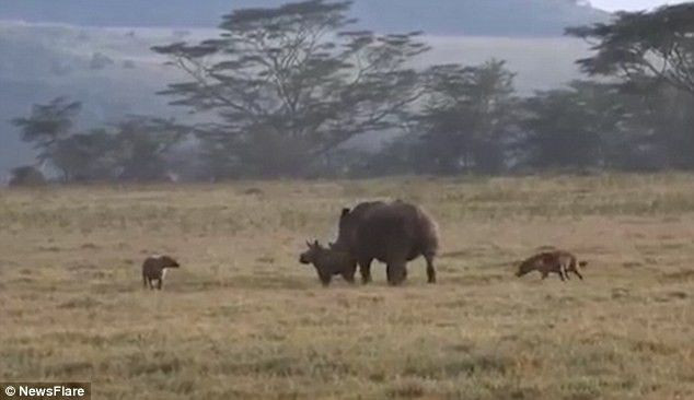 Tê giác mẹ tỏ ra bất lực khi vừa bảo vệ con vừa chống chọi những vết cắn của hai con linh cẩu.