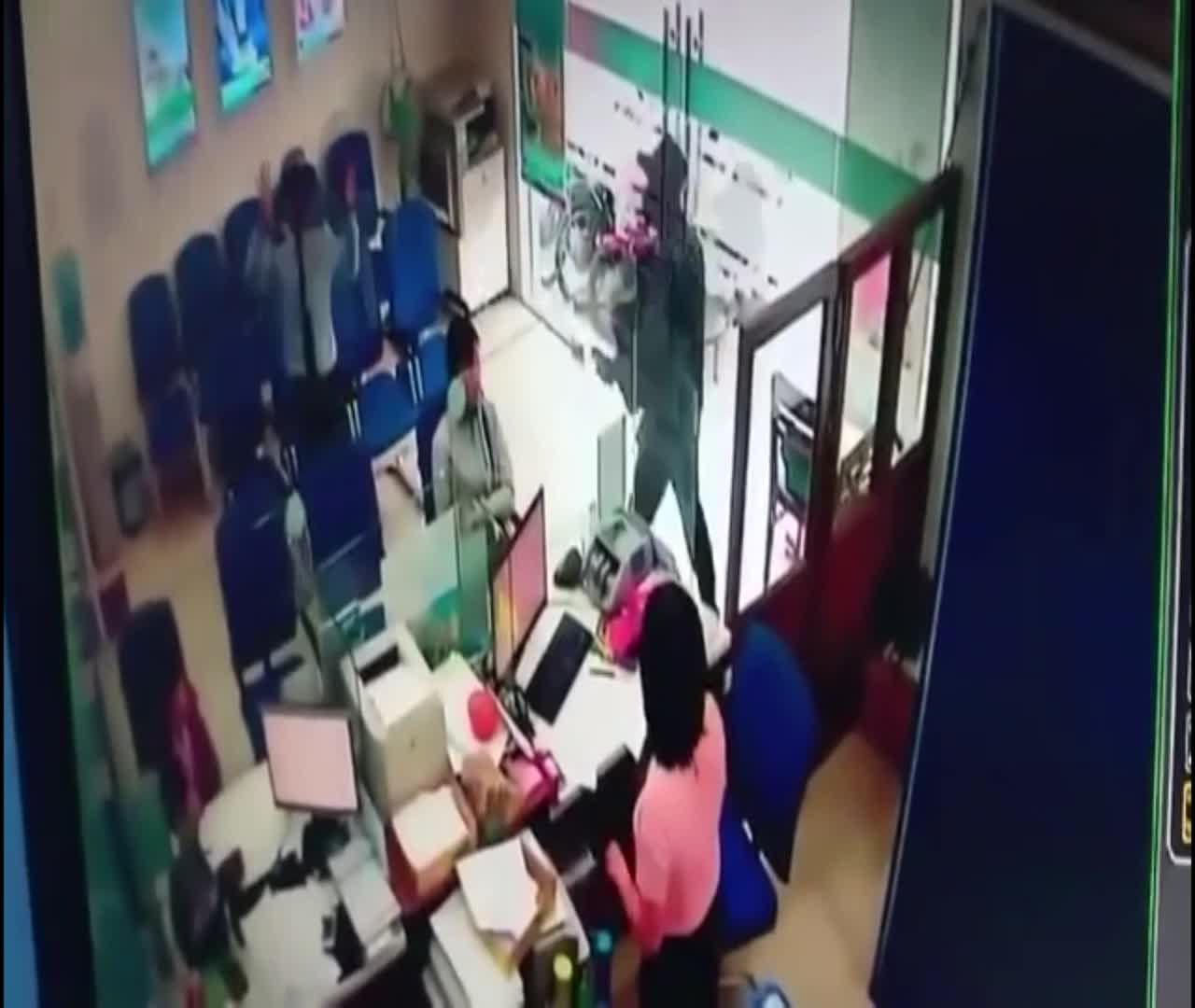 Hình ảnh từ camera an ninh cho thấy, vụ cướp chỉ diễn ra trong vòng vài phút. Thời điểm trên, bên trong ngân hàng có 5 người (bao gồm một bảo vệ, 2 khách hàng và 2 nhân viên nữ).