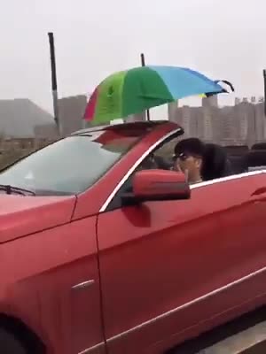 Đoạn video được quay tại Trung Quốc ghi lại cảnh một thanh niên lái xe mui trần, tay cầm ô che mưa gây bão mạng xã hội.