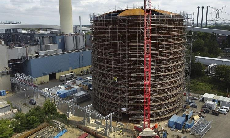Tháp nước nóng khổng lồ với chiều cao 45m, sức chứa 56 triệu lít giúp sưởi ấm cho các hộ gia đình ở Berlin (Đức) sau khi hoàn thành vào cuối năm nay.