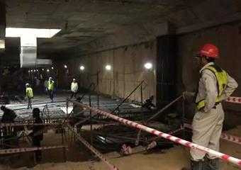 Phương pháp top-down (làm tường vây và cọc chống trước, sau đó đào đất và thi công các sàn từ trên xuống) để giảm thiểu rủi ro lún sụt. Sau năm rưỡi thi công, nhà ga đã hoàn thành 25%.