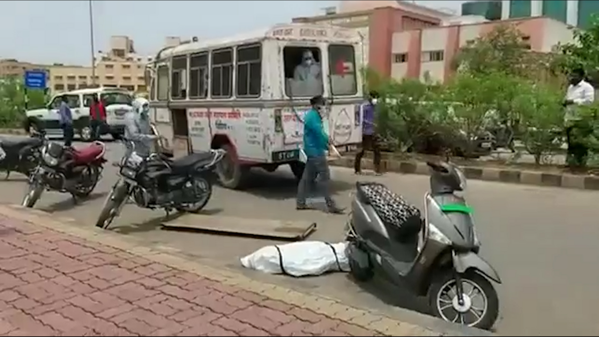 Thi thể rơi ra khỏi chiếc xe chở xác bệnh nhân chết vì COVID-19 từ bệnh viện tại Ấn Độ.