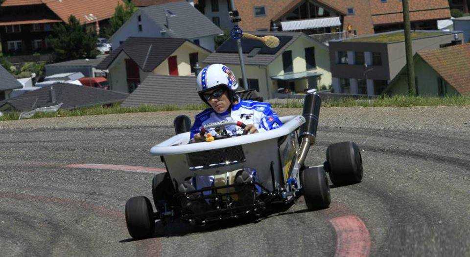 Chiếc xe go-kart có thiết kế độc đáo như một chiếc bồn tắm, thậm chí còn có cả vòi hoa sen lao đi vun vút trong cuộc đua xe trên đồi Bergrennen Reitnau.