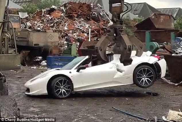 Theo Daily Mail, chiếc xe Ferrari 458 Spider trị giá 200.000 bảng Anh (khoảng hơn 6 tỷ đồng) bị phá hủy tại bãi phế liệu sau khi cảnh sát tịch thu từ người sở hữu.