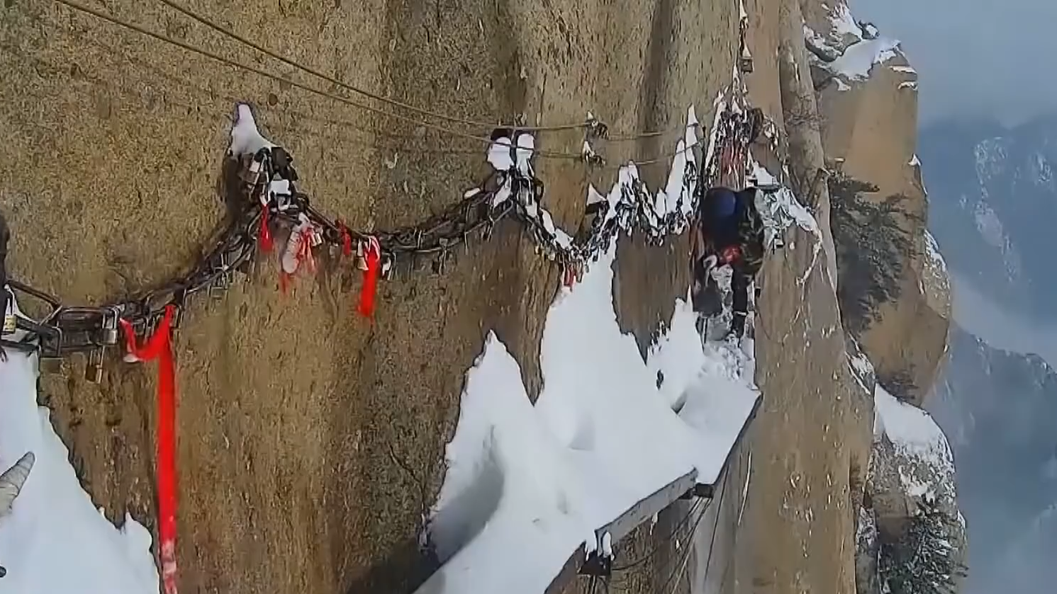 Đoạn video ghi lại cảnh công nhân Trung Quốc dọn tuyết trên sạn đạo – đường xây bằng ván xếp hai bên sườn núi đá. Bề rộng của sạn đạo này chỉ khoảng 30 cm và được cho là ở khu vực núi Hóa Sơn, thuộc dãy núi Tần Lĩnh ở phía nam tỉnh Thiểm Tây, Trung Quốc. Độ cao của núi Hóa Sơn là 2.154,9 m so với mặt nước biển.