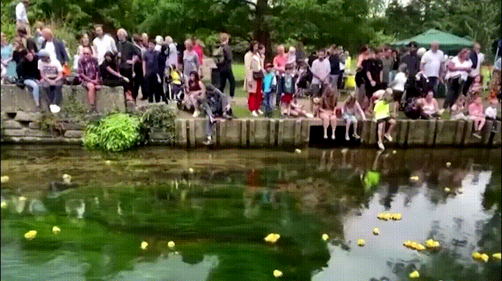 Người dân có mặt bên bờ sông Stour ở Canterbury (Anh) để theo dõi cuộc đua vịt nhựa gây quỹ do một câu lạc bộ ở địa phương tổ chức.