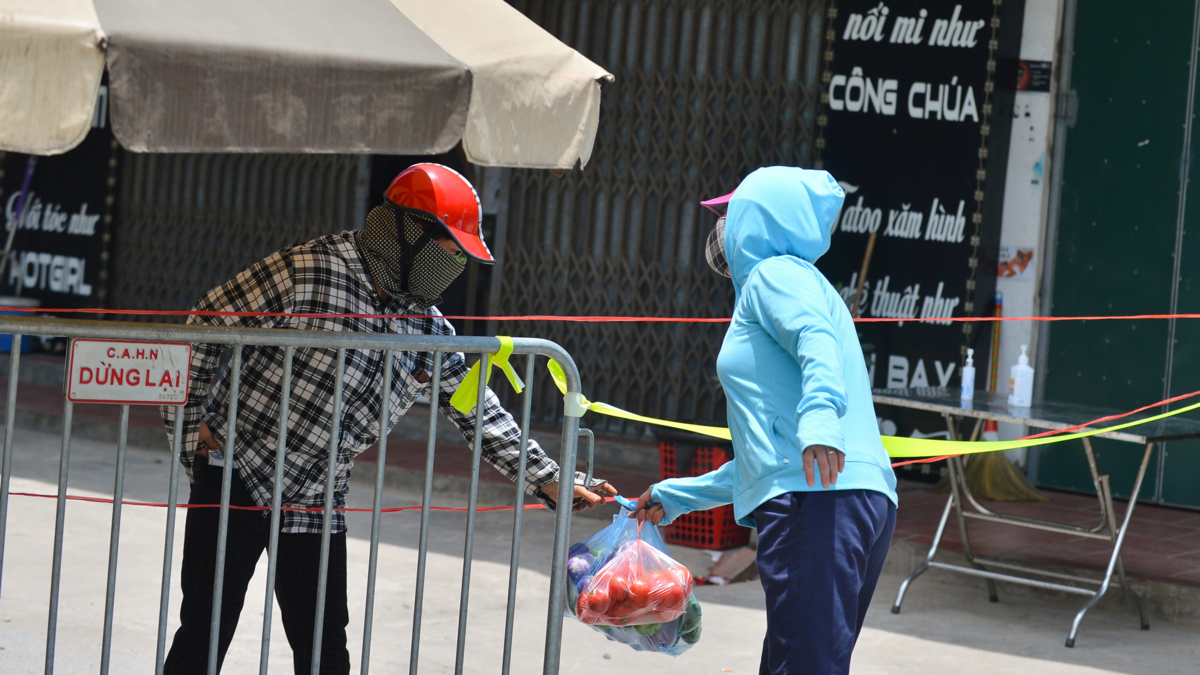 Người dân tiếp tế lương thực cho xã xã Hiệp Thuận (Phúc Thọ, Hà Nội), nơi vừa ghi nhận 7 ca mắc COVID-19 ở Hà Nội.