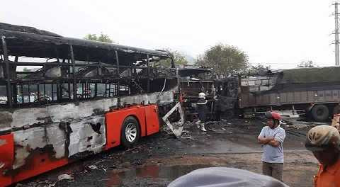 (VTC News) - Rạng sáng 22/5, xe khách giường nằm chạy tuyến Quảng Ngãi – TP.HCM, khi đến thị trấn Thuận Nam, huyện Hàm Thuận Nam, tỉnh Bình Thuận bất ngờ va chạm với ôtô khách đi hướng ngược lại, bốc cháy dữ dội.